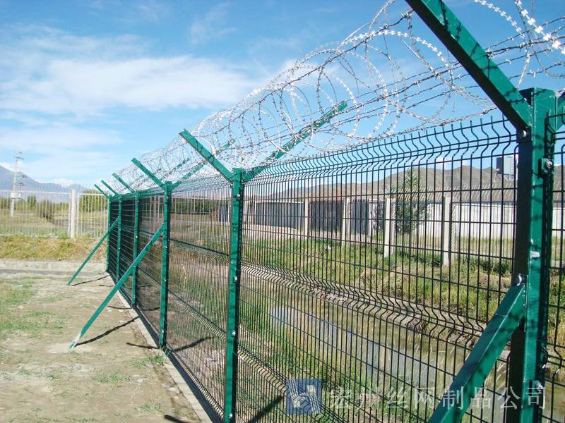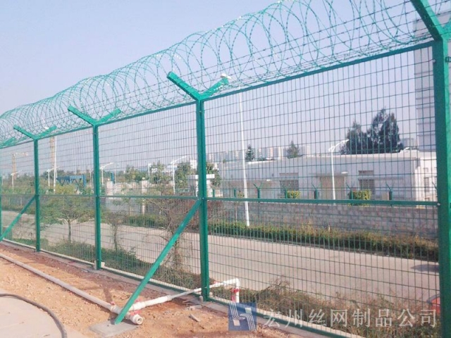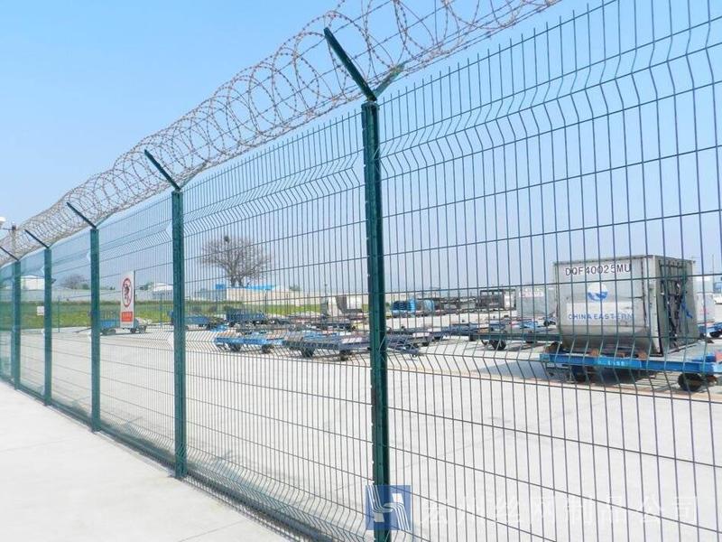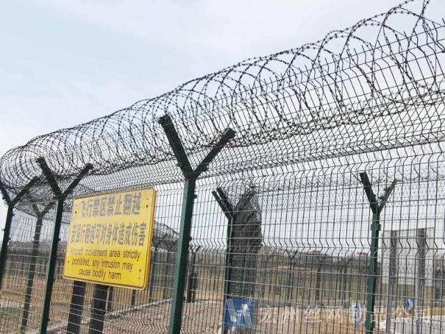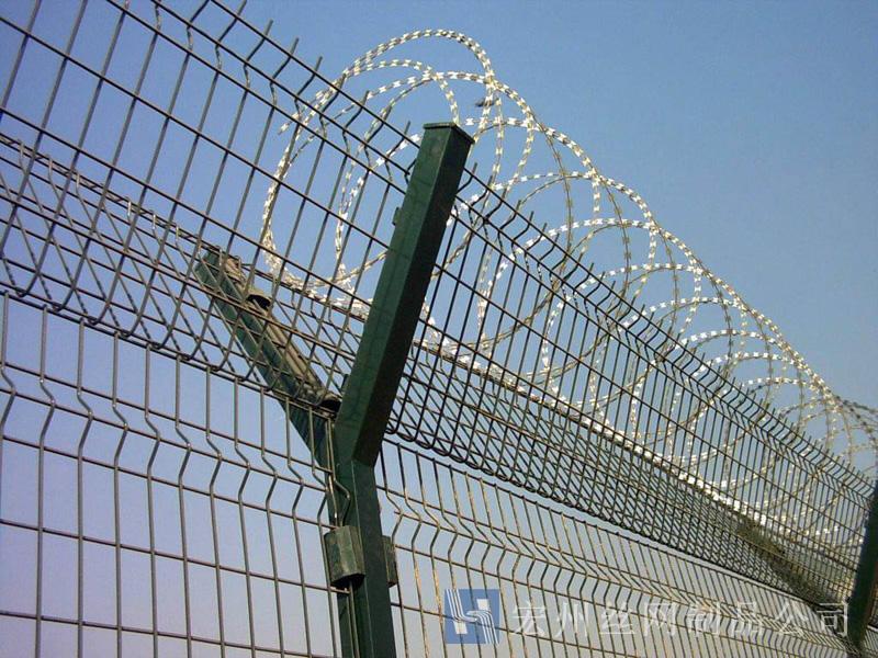 機(jī)場(chǎng)鐵絲圍欄網(wǎng)產(chǎn)品具有:美觀、大方、防腐性好、易保養(yǎng)、防攀爬能力強(qiáng)。近年來,被廣泛應(yīng)用在機(jī)場(chǎng),軍事基地等高安全場(chǎng)所。注:假如在機(jī)場(chǎng)護(hù)欄網(wǎng)頂部加裝刀片刺絲、刀片刺繩后又很好的增強(qiáng)了安全防護(hù)機(jī)能。